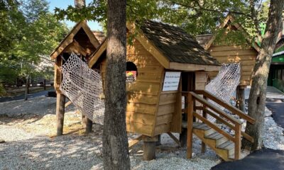 Kids can explore the treehouse village crawling their way through the rope bridges.
